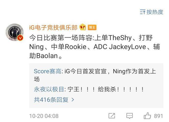 很多iG的粉丝看到小乐言的状态后,觉得很不满意。这个时候不少粉丝就想起了那个喜欢“搞事”的宁王,敢打敢拼的风格虽然风险很大,但是绝不因为胆怯而选择平庸。大家都希望看到那个前期就打乱对手节奏的iG,从而希望宁王能再次首发出战。