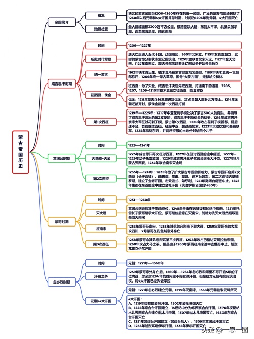 4大汗国: A、1219年拔都建金帐汗国,1502年金帐汗国灭亡 B、1225年察合台汗国建立,14世纪中分为东西察合台汗国,1370年权臣帖木儿灭西察合台建立帖木儿帝国,1507年帖木儿帝国灭亡,1683年东察合台汗国灭亡 C、1251年窝阔台汗国建立(窝阔台后人),1309年窝阔台汗国灭亡 D、1256年旭烈兀建伊尔汗国、1335年伊尔汗国灭亡