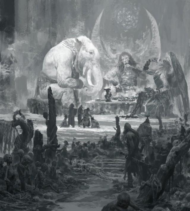 骷髅若岭,骸骨如林。人头发躧成毡片,人皮肉烂作泥尘。人筋缠在树上,干焦晃亮如银。真个是尸山血海,果然腥臭难闻。东边小妖,将活人拿了剐肉;西下泼魔,把人肉鲜煮鲜烹