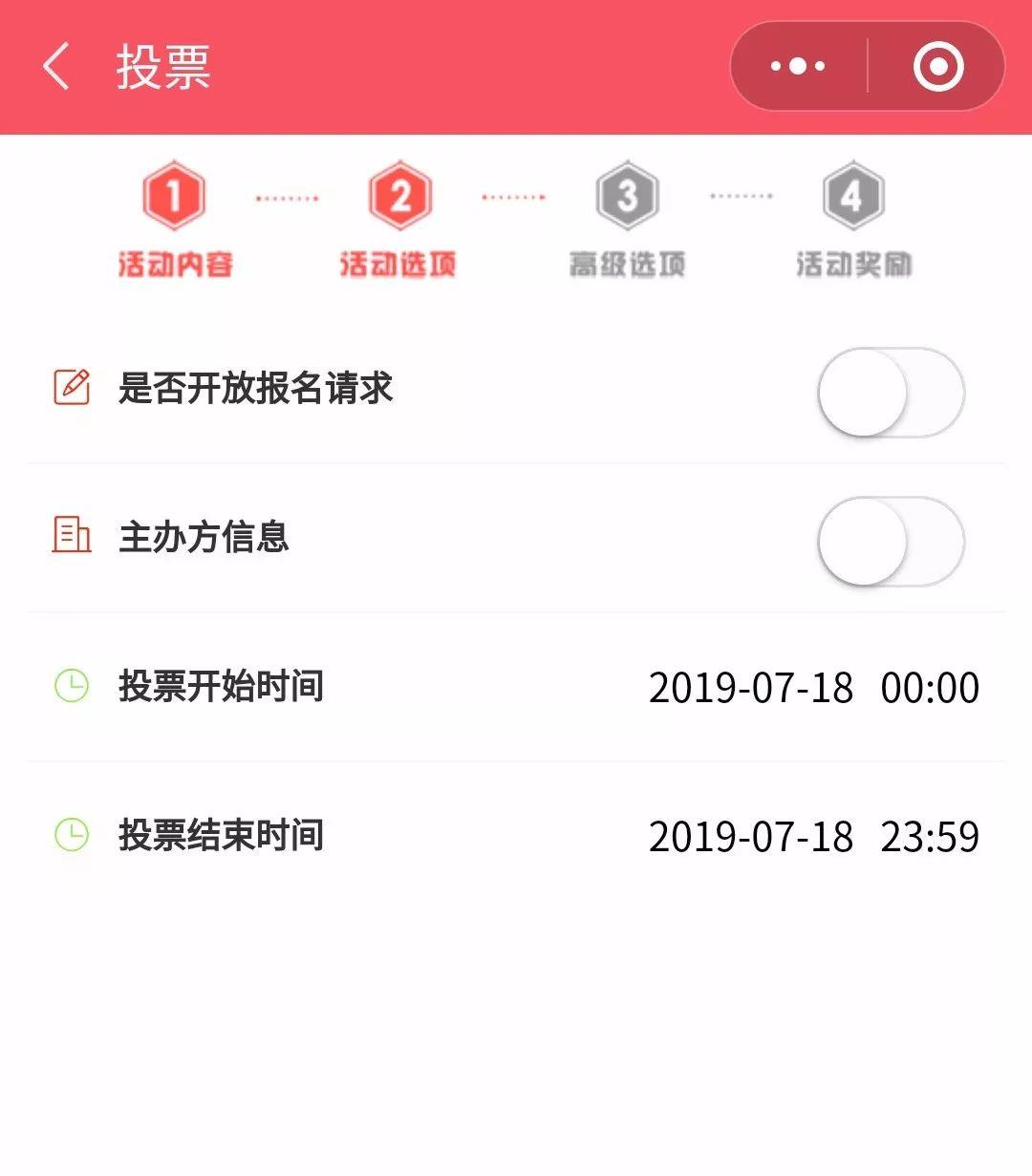 发起人可以自主设置“是否开放报名请求”填写“主办方信息”设置投票起始时间。