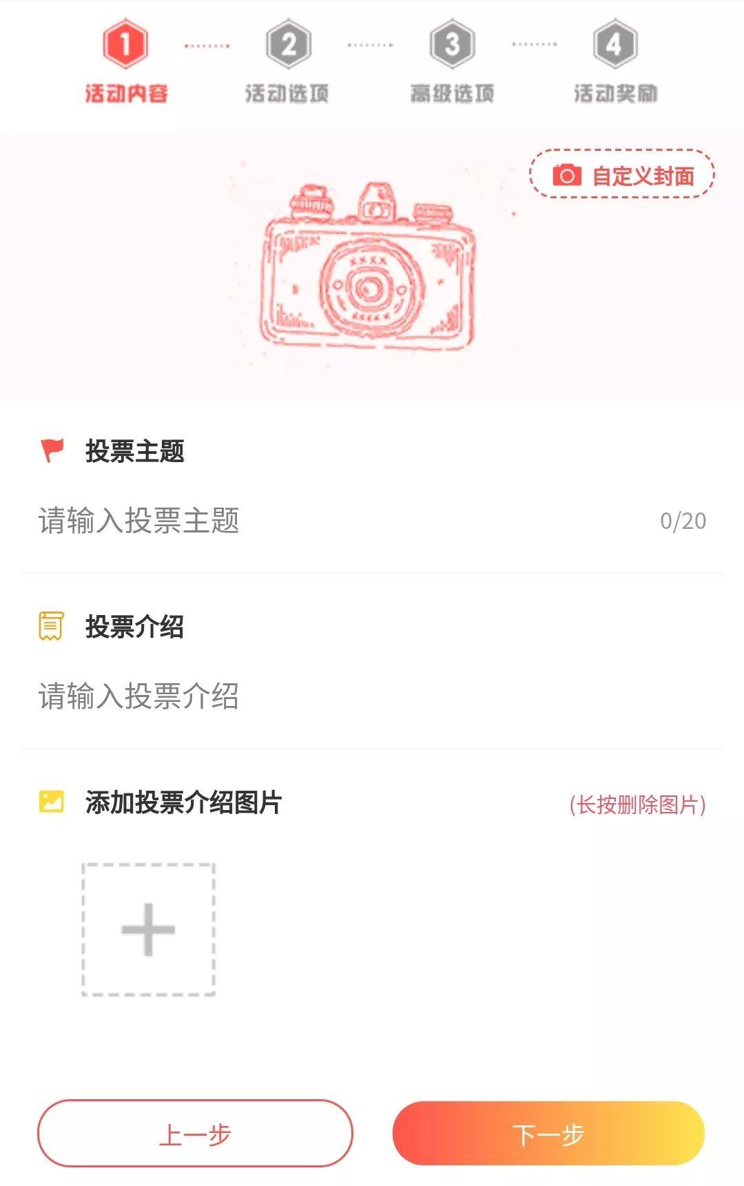 当需要把投票链接分享给朋友时,一个赏心悦目的封面图面是很重要的,设置一张直击主题或者高端大气上档次的分享封面引起接收人的好感,那票数还不是唰唰往上涨啊。但是该选项非必填项,一般情况下用户在转发分享时封面默认为活动的主封面。