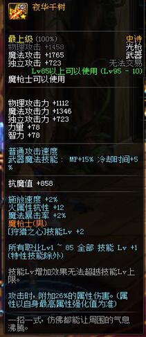 首先是26%属白、全部技能加一的光枪夜华千树,搭配一些如万事套这类的高属强装备有着不错的伤害。