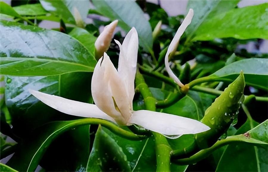花为白色或淡黄色,香味浓郁;花瓣较为肥厚,大致形状为长披针形。