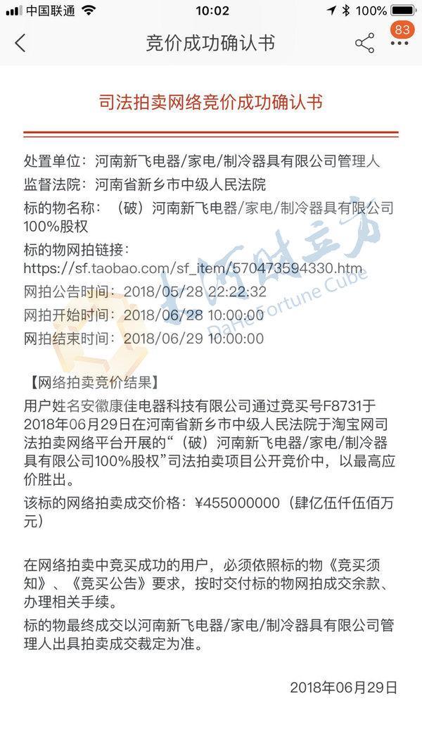 6月29日10时,河南新飞电器有限公司、河南新飞制冷器具有限公司、河南新飞家电有限公司(以下简称新飞公司)100%股权拍卖迎来结局,康佳最终以高出底价500万元的出价胜出。