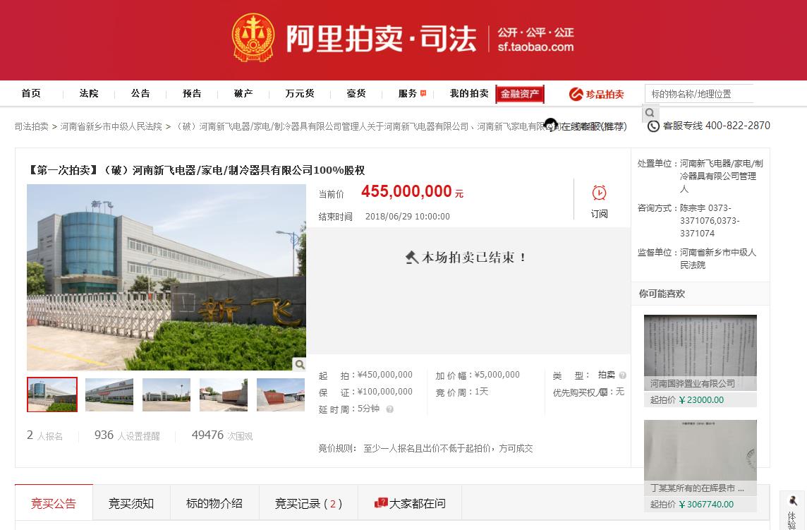 6月6日,新飞公司的股权及资产拍卖挂上了阿里司法拍卖平台。