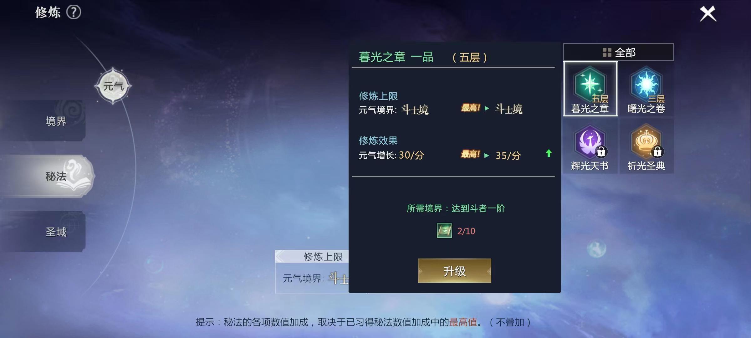 秘法修炼可增加自然吸收元气的效果,每次秘法的提升元气修炼的速度就会增长。秘法分为四层,每层秘法分别有两到三种。需要使用与自身职业相匹配的残章进行升级。每提升一次所需要的残章数量就会增加。秘法可以通过活动签到,福利领取,副本,限时活动进行获得。元气境界每个境界分为十阶,可通过获取元气提升阶级,当达到满阶后,可完成任务突破境界,玩家实力将得到大幅度的提升。
