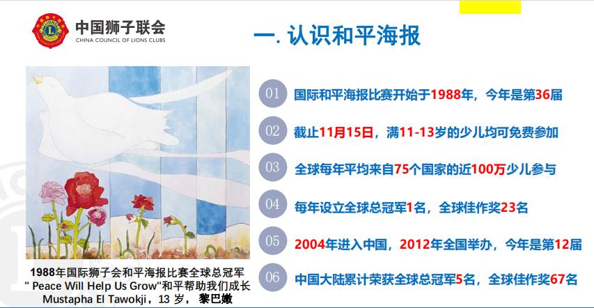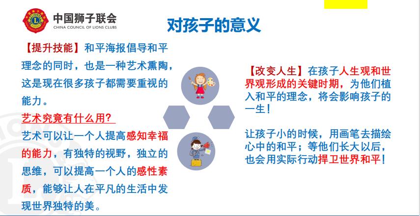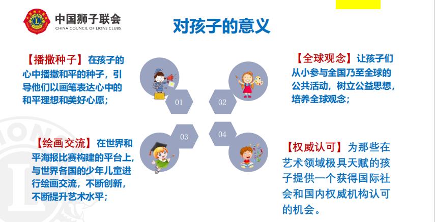 自2012年开始举办“全国少年儿童世界和平海报作品征集活动”至今,中国狮子联会已在全国近二十个省市,组织数百万人次少年儿童参与,成为具有较高影响力的少年儿童绘画公益活动。