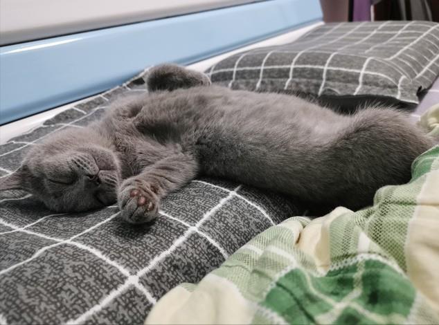 我养了一只蓝猫,一直把它当孩子养的,一开始我是不让它上床睡的,房间都不让进,后面底线慢慢消失了,就让它跟我一起睡了,觉得这样可以增进我们的感情。