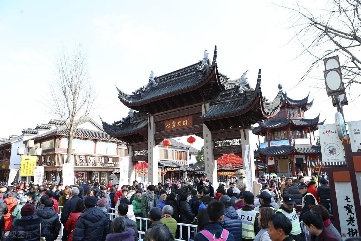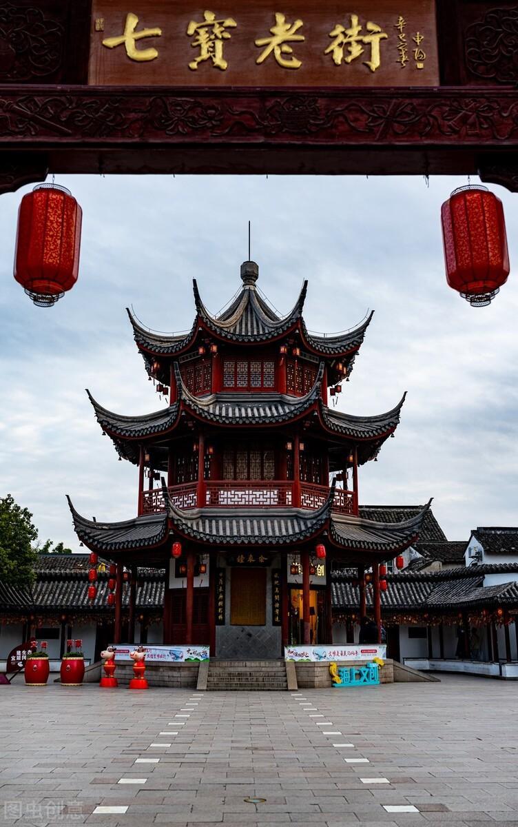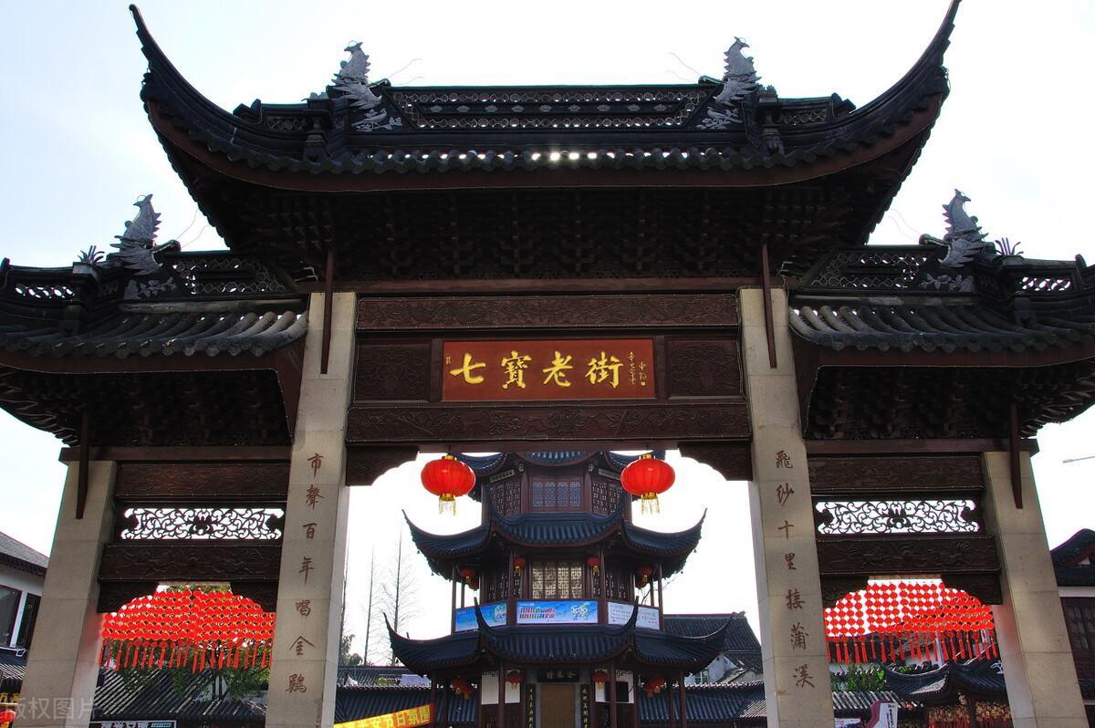现在想要进去参观,需要本人出示行程码和测量体温,安全后排队进入。这里是老街的正门,可以看到七宝老街的门牌坊,正对大门的三层宝塔是七宝钟楼,是七宝古镇的标志性建筑。在民间一直流传着七宝拥有“七件宝”之说,分别是金字莲花经、氽(tun)来钟、飞来佛、神树、金鸡、玉筷和玉斧。其中金来钟就藏于七宝钟楼,距今已有六百多年的历史。撞钟在佛教中有清烦恼、增智慧、保平安的寓意。每年除夕送旧迎新,钟声四起,为七宝百姓祈福。