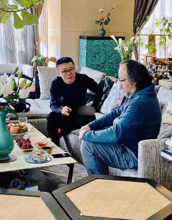 窦唯和友人坐在宽敞的客厅里,茶几上摆满了水果和鲜花。布艺沙发看着挺普通,但价值不菲。