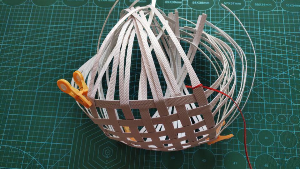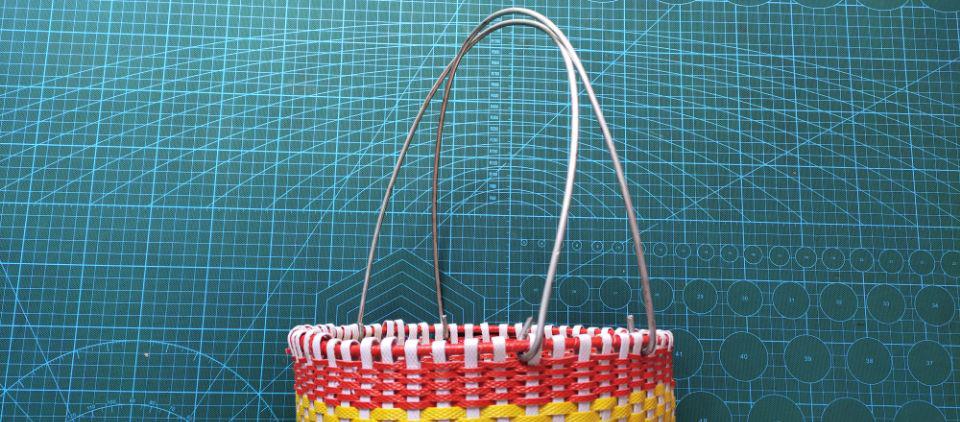 把二根铁丝的二头搞成一个小钩钩,然后搞弯来按在筐子口上,再用老虎钳把小钩钩夹紧在筐口上。再次的取铁丝三倍长的红色打包带劈成二半,包在手提铁丝上。记得不要把铁丝漏在外面哦,那样的话就会不美观了。