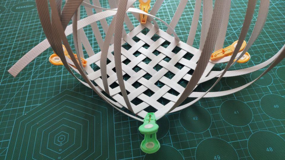 方格编完后把四周的打包带调整到平均一样长的长度。中间的方格要一样大哦,然后再把主杆折出一个印来。让四周的打包带都能竖起来。