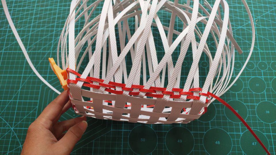 因为张勤勤为了新手更容易上手才剪掉了白色主杆劈成二半的一根打包带剪掉了一根,所以后面大家学编时直接就可以编下去了。编法也是非常的简单的,就是一根里面一根外面的编。