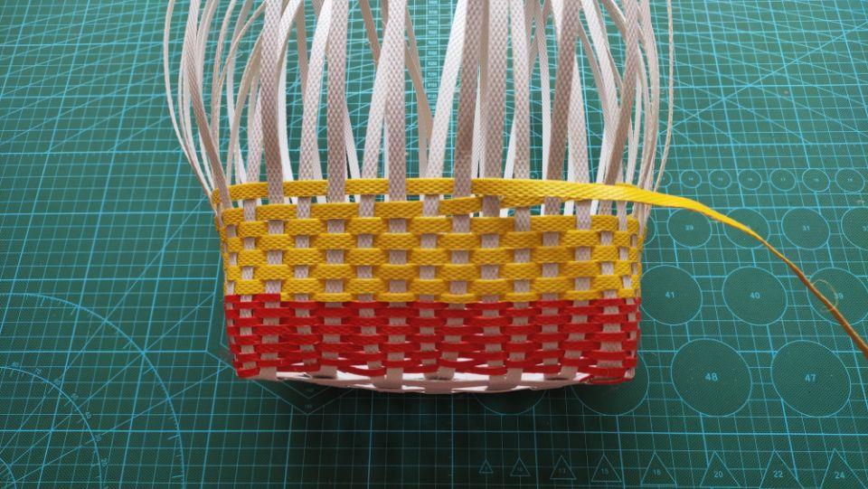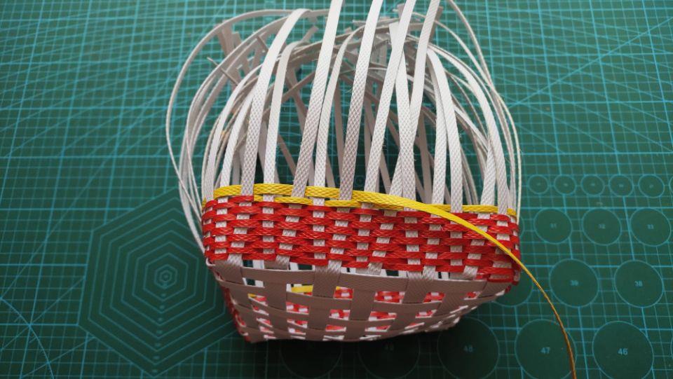 五米红色打包带编完后,再取一根黄色的打包带劈成三份,取其中的一份黄色的打包带接红色打包带编下去。记得编的时候一定要把据白色主杆的间距哦。一定不能让主杆往里面走了,那样的话编出来的篮子就不好看了啦。