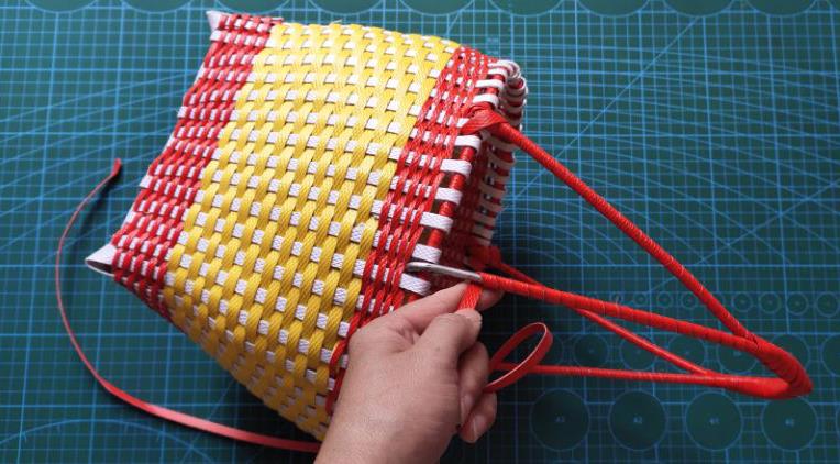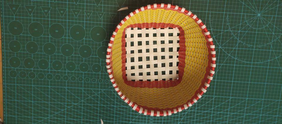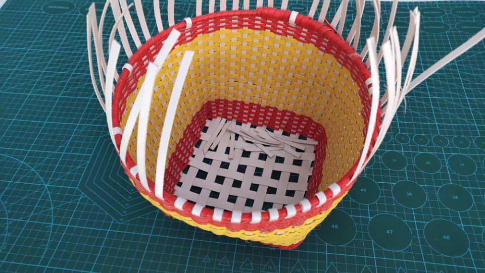 编完了黄色的打包带后,再次的接劈成四份的红色打包带,把五米全部编完,编完了差不多就好啦。记住哦,从头到尾的编的过程中一定要把据篮子的整体大小哦,篮子口一定要慢慢的在编的过程中变大,篮子的口要比底大一些,这样子才会更好看哦。
