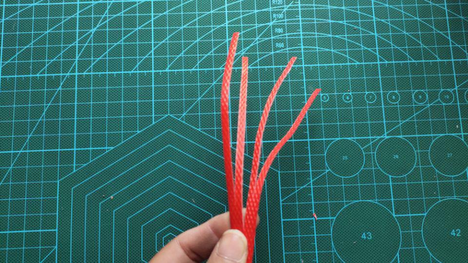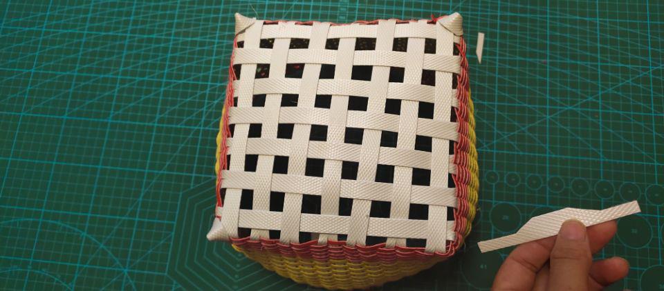 把白色主干劈成二半,然后把其中角落的一根白色主杆劈成二半后剪掉一根,这样白色主杆的打包带就刚好成为了单数了。这样就可以直接编到头了。然后用劈成四份的红色打包带取其中的一根打一个活结,套在被剪掉的那根成单的主杆上。