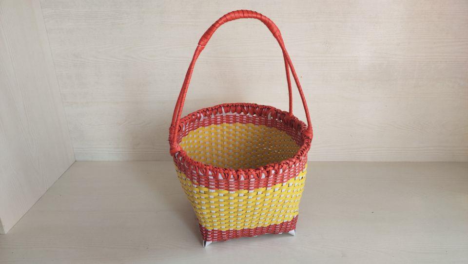 今天张勤勤要来给大家分享一个四方形底部的圆款手提篮子,这样的篮子早在二十年前可谓是民间的潮流了。在民间农村,基本家家有几个篮子不是竹篾编的就是这种打包带编的也十分的实用的买菜、洗菜、挂菜的菜篮子。张勤勤废话也不多说了,咋们开始吧。