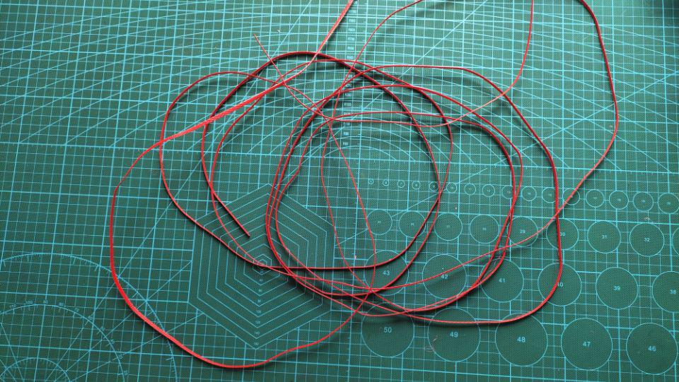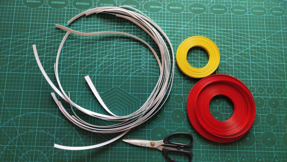 取红色打包带,用剪刀分成四份,来回的撕法把打包带均匀的劈开,一般来说要劈几米呢?其实这个不重要,因为不够可以接的,每个人的手势不同用的量也会不一样,在这里张勤勤劈了五米的样子哦。