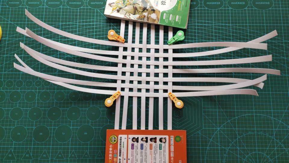 第一步:张勤勤用了白色14根70厘米的打包带,这个白色比其它颜色略厚一点哦。14根打包带分成二份,每份7根。用书本压着二头,方格编法的编下来。