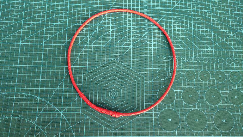 用一根8号的铁丝围着篮子口一周的长度再重叠5厘米的样子。然后剪下来,再用一根红色打包带劈成二半,劈的长度要是铁丝的三倍长度哦。然后把劈好的打包带包在铁丝上。这样子篮子即使在水里洗也不会导致生绣的绣水搞到菜上,然后把包好的铁丝放在篮子的口上,再把白色主杆往回插,全部往里面插就可以哦。