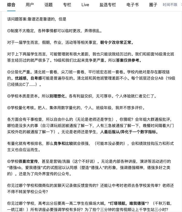 这两天写了一些关于德强高中的一些基本情况的介绍,是一些德强高中的学生在知乎上的帖子,我只是做了总结,正反两方面都有。这几个文章的留言有几百条,而留言是两个极端,同样说德强高中的好的特别多,关于清北班、平行班、学校的收费、老师的管理褒贬不一。