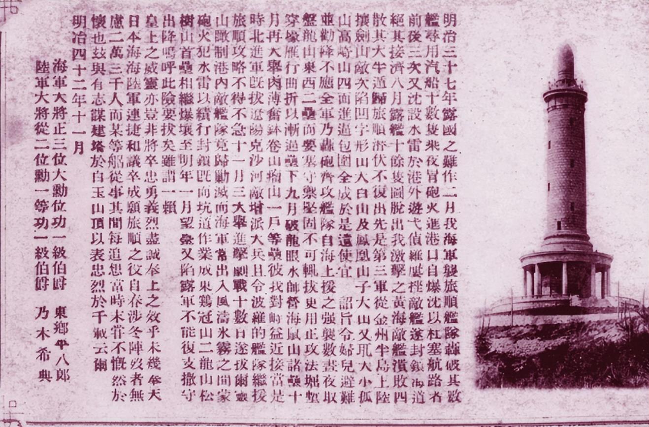 在修建这座塔之后,日本侵略者还在上面题字,大肆宣传指挥战争的东乡平八郎、乃木希典等日俄战争的指挥官是英雄,甚至还加到了小学教科书中。