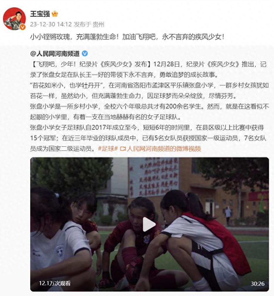 影片导演张媛媛表示,“我们团队的负责人刘磊在看到王珊珊的祝福视频后,凭借老媒体人的知觉,认为张盘小学女足身上一定有非同寻常的故事,立马打电话让我们在完成拍摄任务后前往张盘小学调研。”