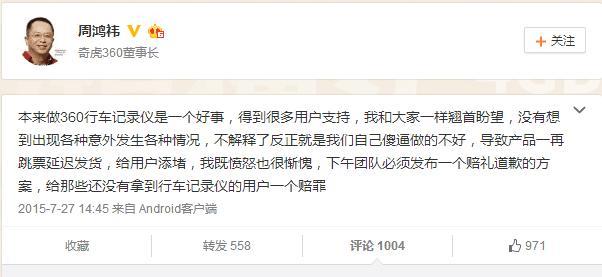 在预售后不久,有不少消费者反映付了钱,但却拿不到产品。随后,360行车记录仪发出公告,就提高该款行车记录仪夜视能力需要进行固件升级,延迟发货。就延迟发货一事,360CEO周鸿祎曾在微博上发出道歉信。