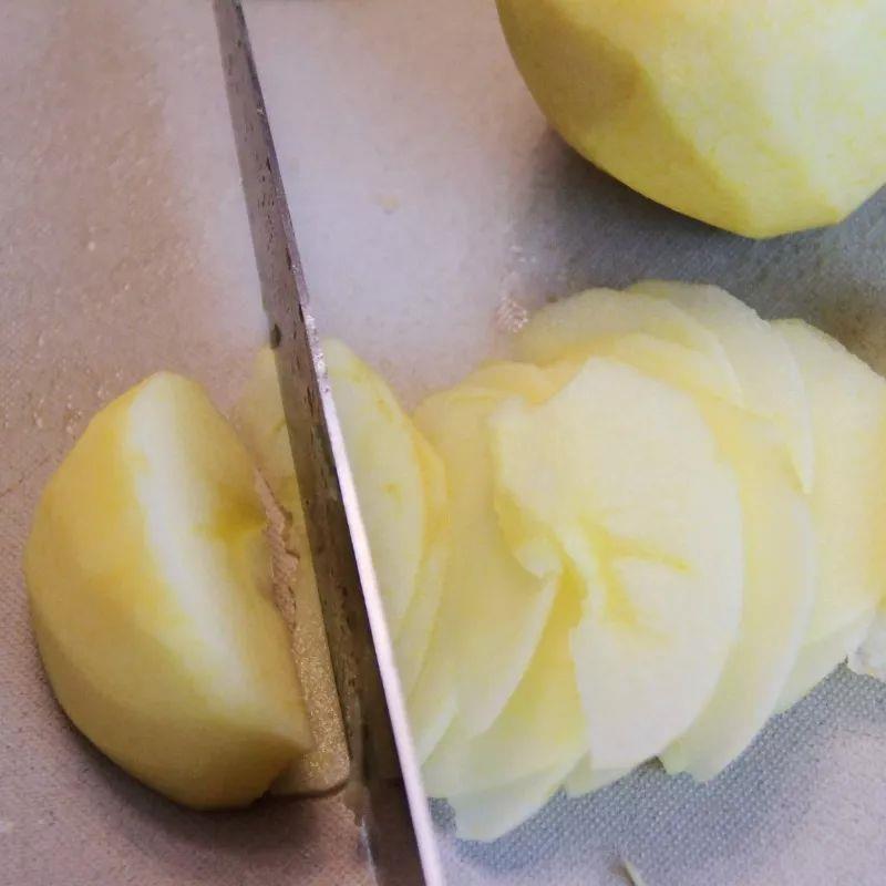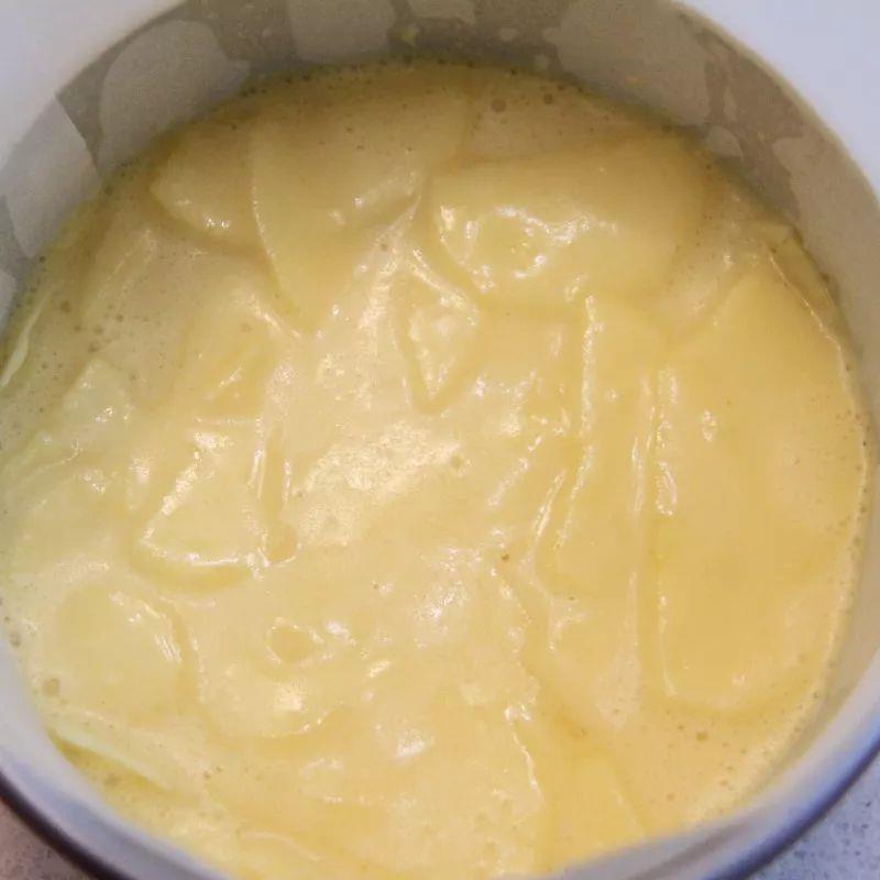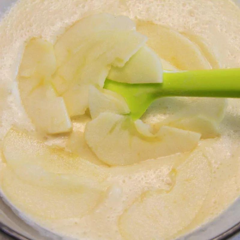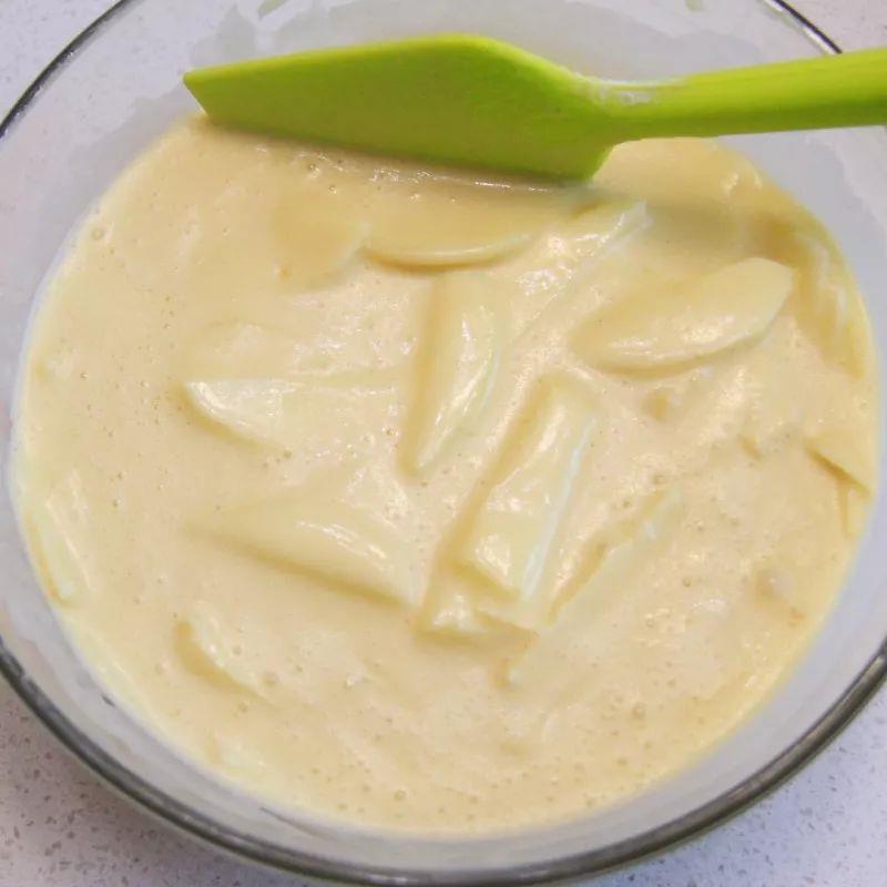 7、苹果去皮去核后切成均匀的薄片,边切边放到面糊中,让每一片苹果都裏上面糊。