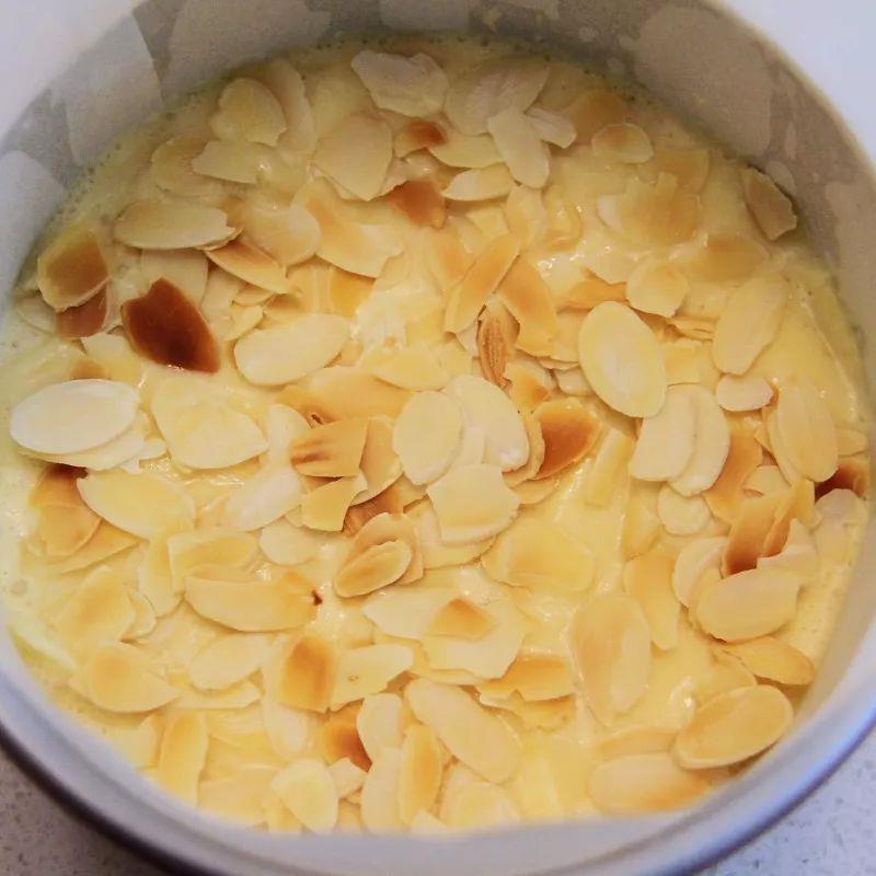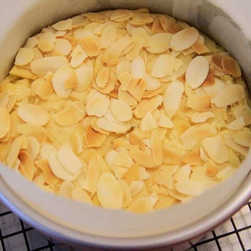 8、将苹果蛋糕面糊倒入6寸戚风模具中,适当调整让表面平整,最后铺一层杏仁片。