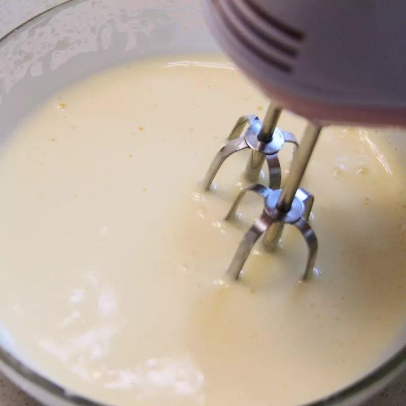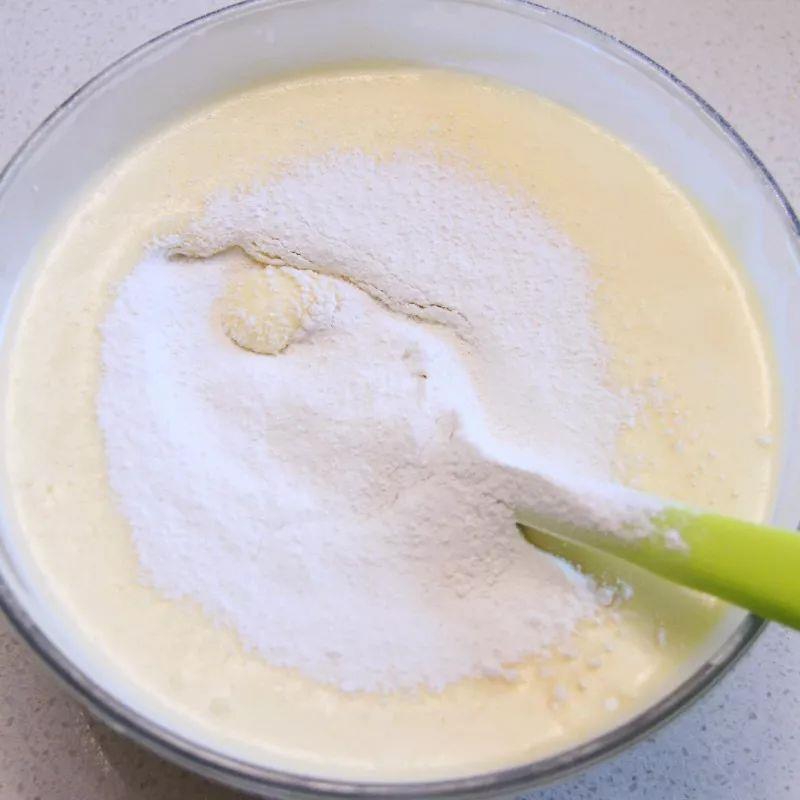 6、加入过筛的低筋面粉,搅拌均匀至无颗粒状(面糊可过筛一遍)。