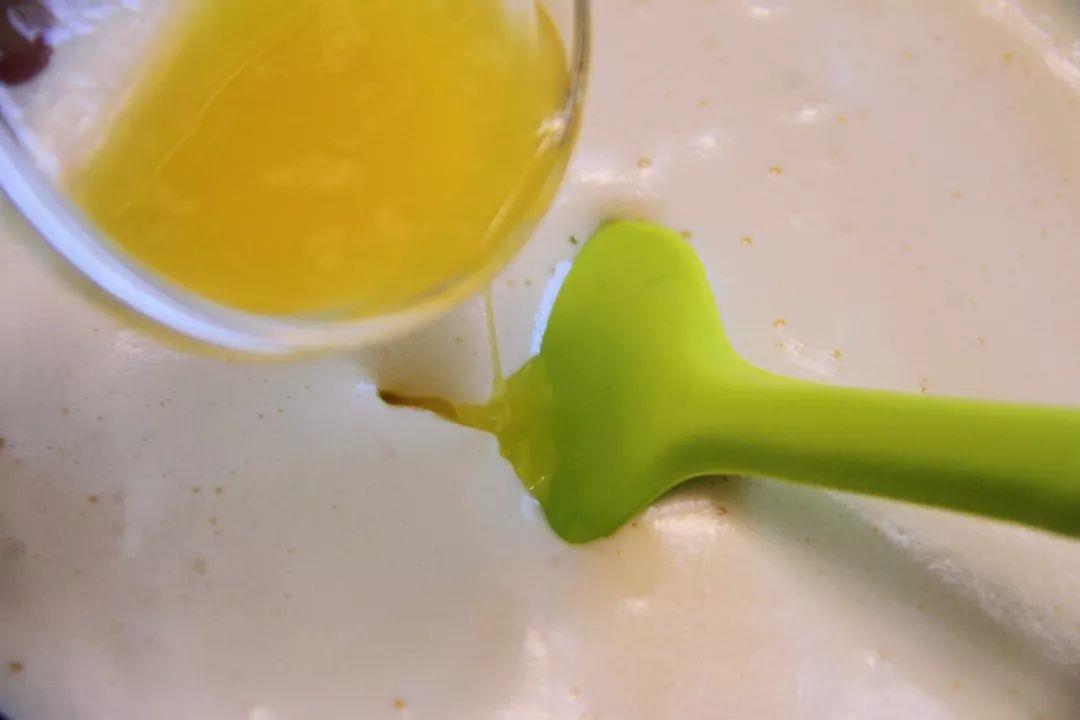 4、黄油隔水融化成液体状,顺着刮刀缓慢加入到全蛋液中,拌均匀。