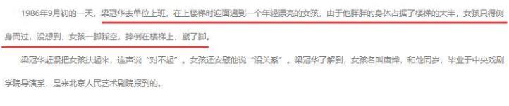 一天,去单位上班的梁冠华在楼道上与那个女孩正面碰上。梁冠华胖胖的身躯将空间占去了大半,瘦弱的女孩准备侧身而过。