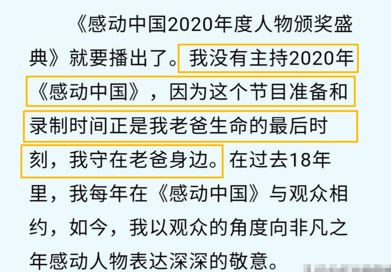 直到节目播出后她发出长文,大家才知道到底是怎么回事,她表示:“我没有主持2020年《感动中国》,因为这个节目准备和录制时间,正是我老爸生命的最后时刻,我守在老爸身边。”