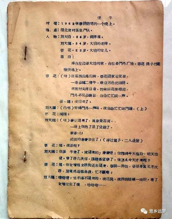 《借牛》现代小戏。天门岳口文化站老站长刘高编剧,1964年由天门县天沔花鼓剧团演出。写生产队饲养员刘大伯,一心维护集体利益,爱牛如命。女儿春花来借牛去耕自留地,老伴私自将牛借给女儿。刘大伯知道后,连夜将牛追回,并说服老伴,以实际行动教育女儿,维护集体利益。