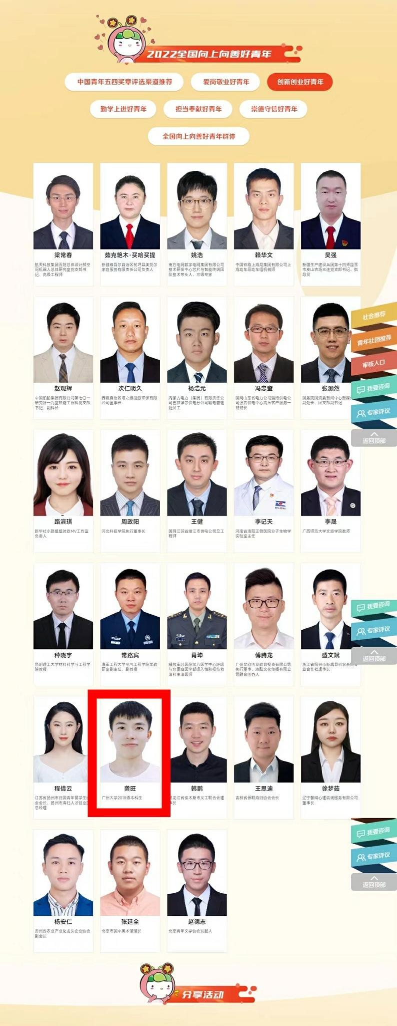 龚旺,番禺区以伴青少年发展中心理事长,这名从粤北贫困山区走出来的农村孩子,中学阶段曾得到师姐的“云陪伴”,帮助他走出了青春期的迷茫。进入大学后,他带动6万余名大学生导师团队共同发起志愿伴学行动。4年时间,跨越28省建起了258所公益伴学网校。以一对一云伴学服务,让300万扶贫干部子女得到照顾与陪伴。在疫情防控的关键时刻,带领团队为2.5万余抗疫英雄们解除后顾之忧。大学毕业后,他投身公益创业,希望能给更多的困境青少年带去光和热,引领他们向上向善。今年,他被共青团中央授予“2022年全国向上向善好青年”称号。