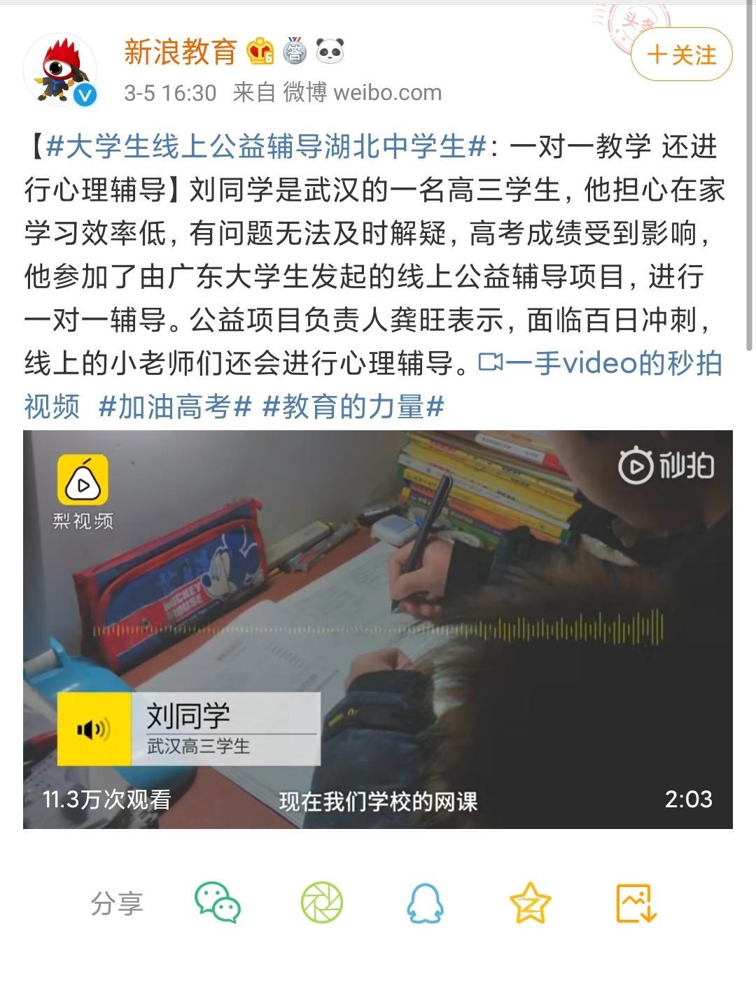 武汉的一名高三学生受疫情影响居家学习,为提高复习效率,及时解疑,便主动地参与了龚旺团队发起的线上公益辅导项目。在云伴学的“小老师”的陪伴下,该同学顺利冲刺高考,成功被浙江大学医学院录取。怀着感恩反哺之心,顺利进阶为大学生的他主动成为了一名以伴志愿者,继续传递公益的火炬。