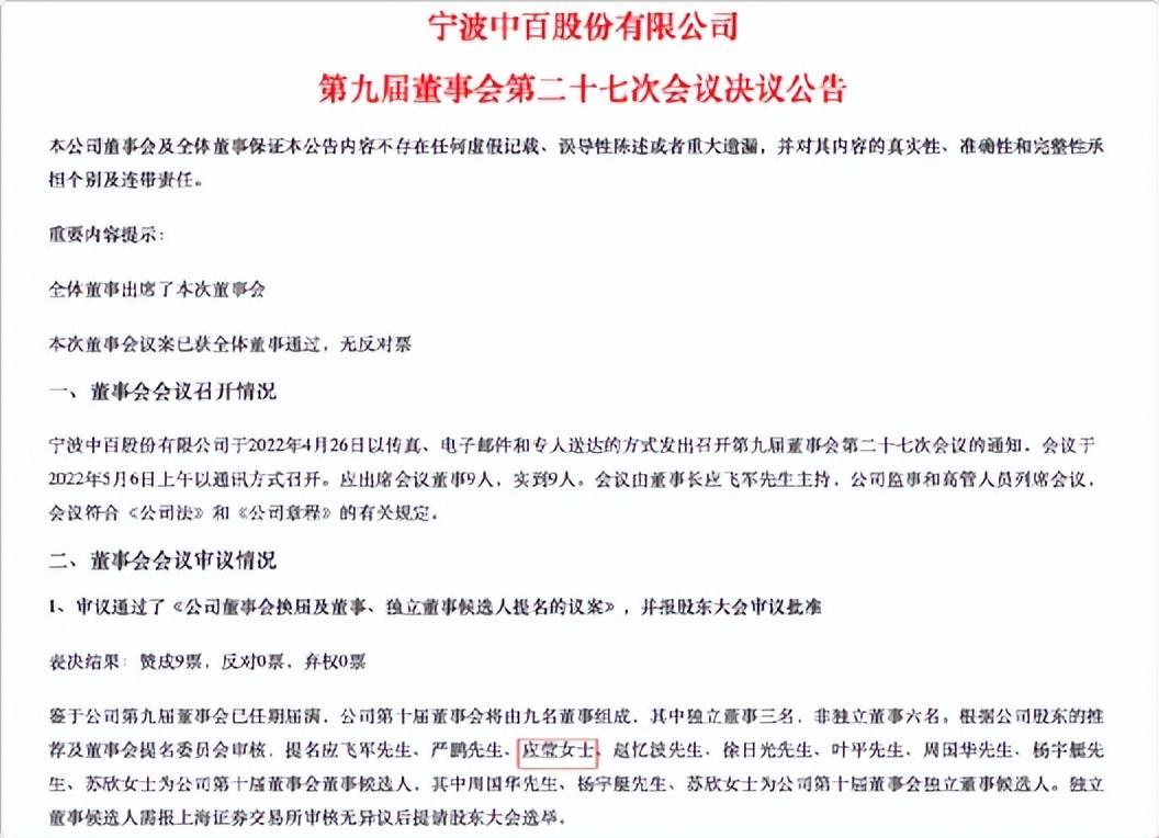 应莹最近一次出现在公众视野,还是今年的5月9日,被宁波中百提名为董事候选人。