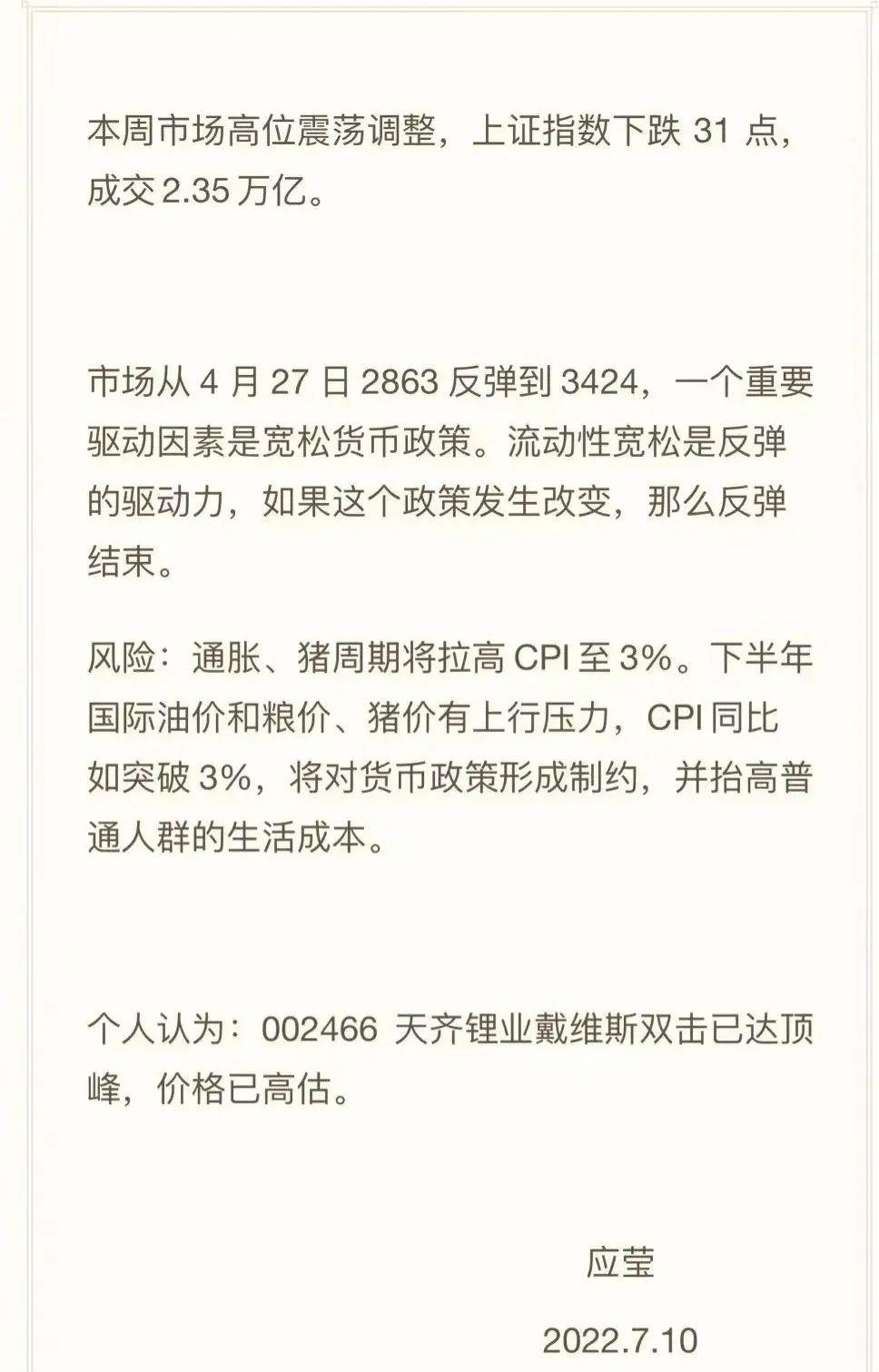 7月10日,应莹在她个人公众号上发布了第二篇“每周市场点评”,在文中她提及,“个人认为天齐锂业戴维斯双击已达顶峰,价格已高估。”然后呢,这短短一句话就成了断魂刀,第二天,“锂茅”天齐锂业最终跌9.16%,报收134.45元,市值跌去了200亿左右。不仅如此,整个锂矿板也全线下挫,融捷股份和盛新锂能跌幅超8%,赣锋锂业跌去了近7%。