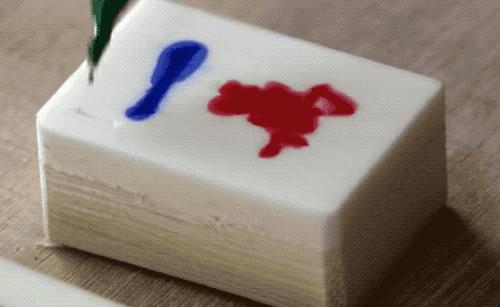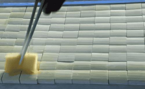 此时麻将的竹表面颜色还不是一致的,需要进行漂白处理统一下色号,让打麻将的时候没人能记住牌…下图就是用浸泡过强力漂白剂的海绵,对麻将的竹表面进行仔细擦拭