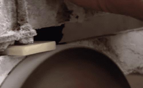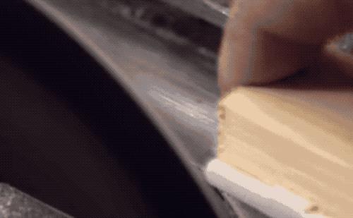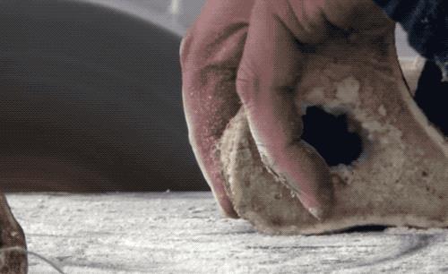下一步是把弯曲的骨头弄得平整。把骨头的直边缘顶向砂轮,先是把凹面给磨平了。