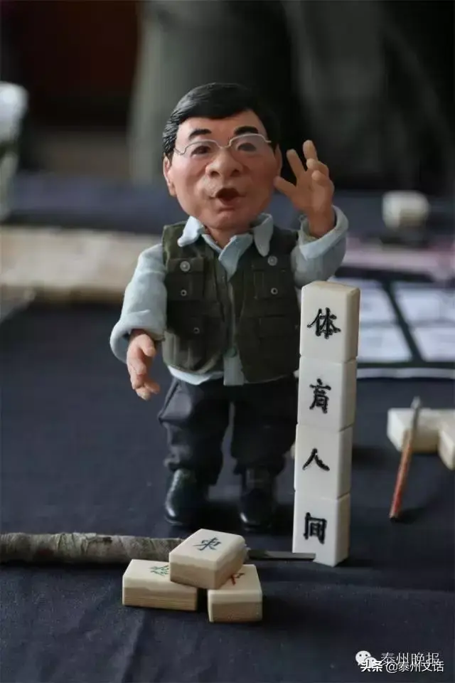 图为央视体育频道记者带来的韩乔生人偶和刘军手工雕刻的麻将。