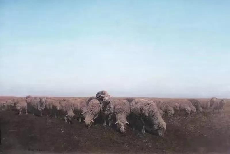 在雁荡山的画室里,我随手从书架上抽出一本画册,翻看了起来。郑艺老师油画集里的代表作《北方》映入我的眼帘:画面中那黑土地上的羊群,低着头在旷野上艰难觅食。大地贫瘠而荒凉,远处天空尚有微弱尘光,只有中间一头羊孤独地仰望着遥远的前方,似乎渴望着在寒冷的大地上有那么一缕温暖的阳光。画面既压抑又畅快,既明媚又忧伤……