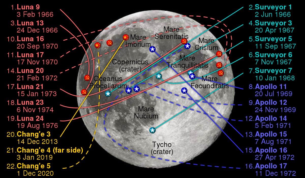 21世纪之前,美苏两国曾经进行过登月任务,其中在1963年到1976年,前苏联一共发射过14次登月任务,其中成功了7次,失败了7次。