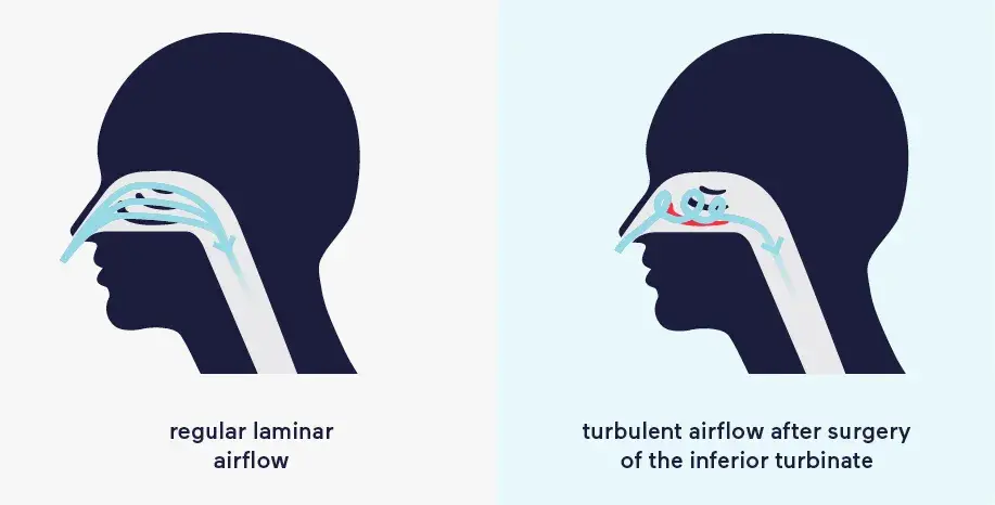 首先,由于患者的鼻甲等鼻腔组织初切除,导致鼻阻力减小,而鼻阻力为肺泡开放和通气提供重要的动力,是维持正常功能所必须的,患者鼻阻力降低,会有一种“空虚”的窒息感觉。