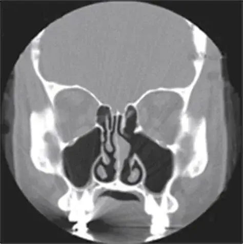 空鼻症的临床标志是“矛盾的鼻塞”,也就是从影像学和解剖上看,因缺乏下鼻甲而导致鼻的呼吸腔道宽大而明显,但是患者依然主诉“鼻子不通气”,或者有类似的难以言状的感觉,如感觉不到气流、气短、呼吸困难,甚至要求辅助通气设备来解决“气促”问题。