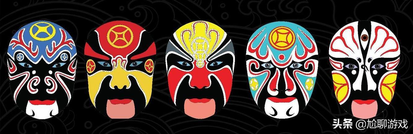 红色:象征忠义、勇敢,代表人物关羽、吴汉;白色:象征奸诈、多疑,代表人物曹操、严崇;蓝色:象征刚直、桀骜,代表人物窦尔墩、马武;黄色:象征彪悍、暴躁,代表人物宇文成都、典韦;金色:象征威武、庄严,多用来表现神仙一类角色,代表人物如来佛、二郎神;黑色:象征性格严肃、不苟言笑、威武有力,也可用来表现肤色黝黑、相貌丑陋,代表人物包拯、张飞、李逵。