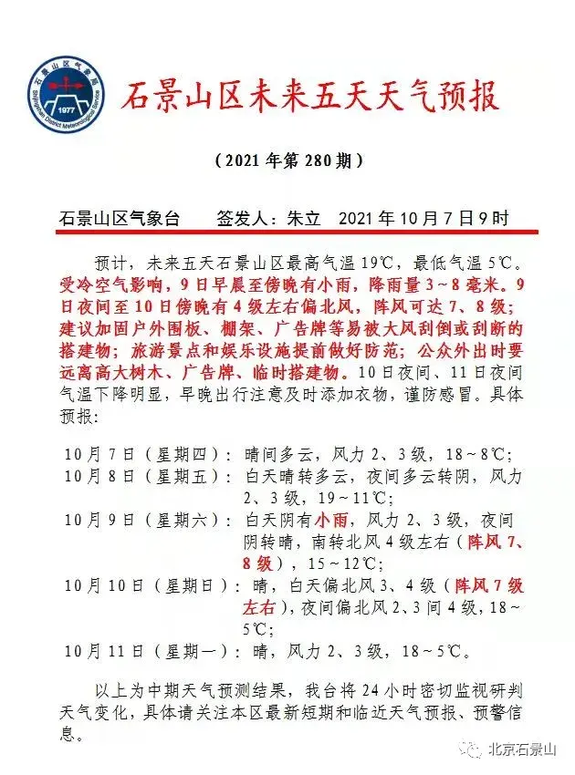 石景山区气象台发布天气预告显示,预计未来五天石景山区最高气温19℃,最低气温5℃,受冷空气影响,9日早晨至傍晚有小雨,降雨量3-8毫米。9日夜间至10日傍晚有四级左右偏北风,阵风可达7、8级。10日夜间、11日夜间气温下降明显,早晚出行注意及时添加衣物,谨防感冒。