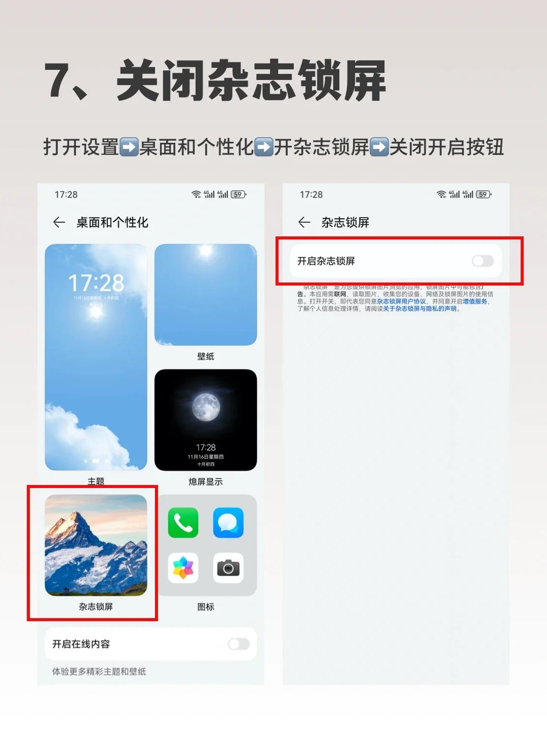 打开设置——桌面和个性化——开杂志锁屏——关闭开启按钮