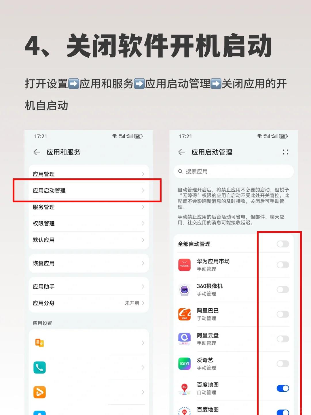 打开设置——应用和服务——应用启动管理——关闭应用的开机自启动
